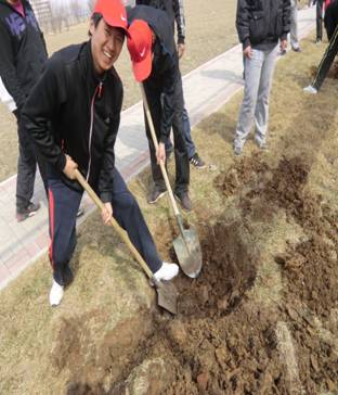 4月9日下午1时左右,院团委书记包健峰老师带领志愿者六十余人,迎着春风,踏着芬芳,来到了大学生活动中心广场前参加义务植树活动。在现场工作人员说明了植树的要求和方法之后,同学们热情高涨,开始行动了。平常连铁锹都没有摸过的同学们,此刻却有板有眼地挖起了树坑。大家分工明确,秩序井然,热闹的场面温馨而快乐。一眨眼的功夫,一个个规格标准的树坑逐渐显现出来。大家的辛勤劳作的景象,让荒芜的土地增添了一道道亮丽风景线。